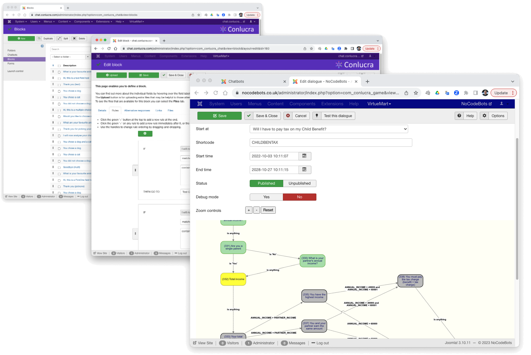NoCodeBots chatbots are built using a simple "Blocks and Rules" paradigm: Blocks contain the questions that you want to ask and the answers that are given to these, and Rules guide the conversational flow from one block to the next until the user reaches their goal.