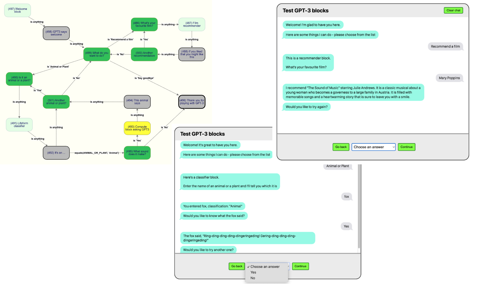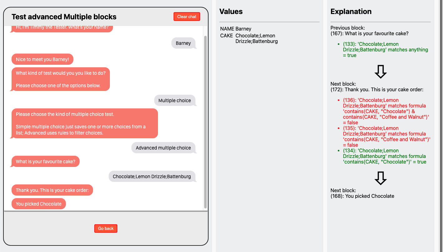 To make it even easier to work out what's going on, an interactive debugging environment lets you walk through your chatbot step-by-step, showing the values of your blocks and explaining the logic that has been used to decide which block to move to next: