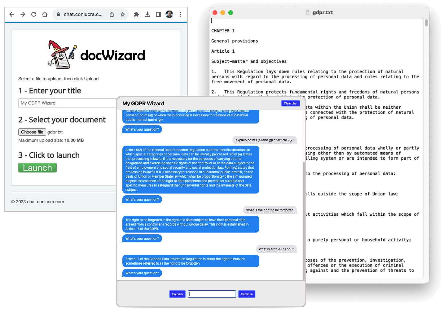 For quick testing, you can use the 3-step docWizard: just enter a title for your chatbot, select the document to attach and launch.