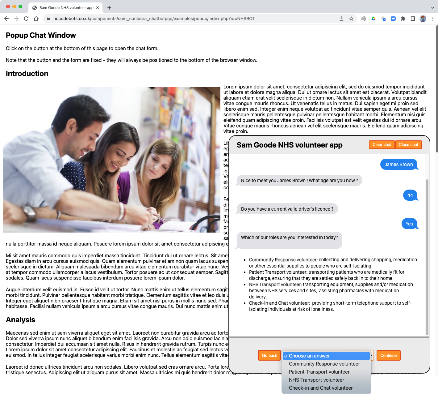 The Popup template contains an unobtrusive chatbot that is displayed when a transparent overlay icon in the bottom-right of the screen is clicked.